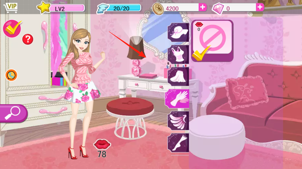 3、到衣帽间场景,右侧有各种服装分类,点不同类别,挑喜欢的衣服给角色穿,搭配出独特风格,换好装后,魅力值变化,还能去参加活动、推进剧情。