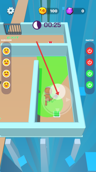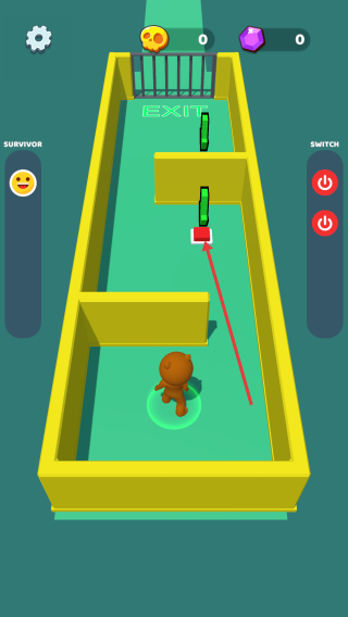 1、操控角色沿箭头,靠近红色的开关,触发机关打开通道,注意躲避路径障碍,为逃生做准备。