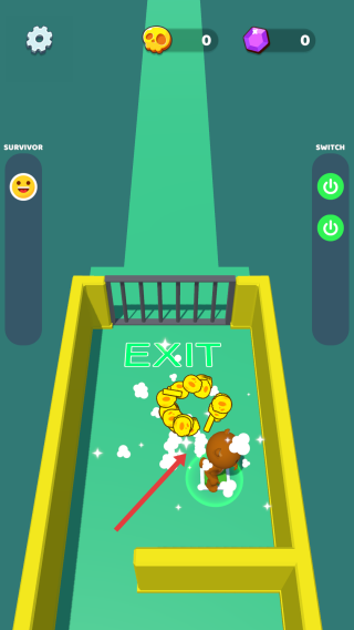 2、突破机关后,沿箭头冲向EXIT,拾取沿途金币,加速移动别停留,尽快抵达出口完成关卡。