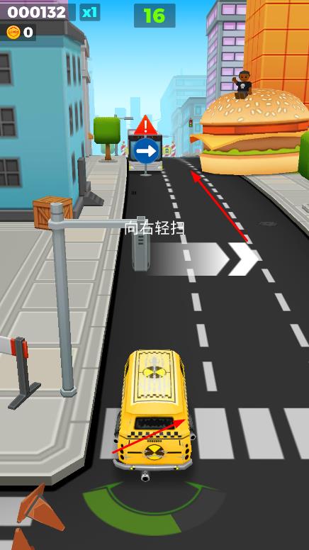 2、在操作过程中,躲避道路上的障碍物,收集金币等道具,根据提示按下以加速 ,点击屏幕上的加速按钮,提升汽车的速度。