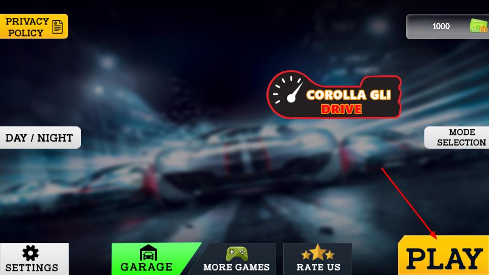 1、点击界面右侧PLAY按钮开启竞速,可先通过MODE SELECTION选定模式,搭配DAY/NIGHT切换场景氛围,即刻驾驶汽车踏入城市赛道。