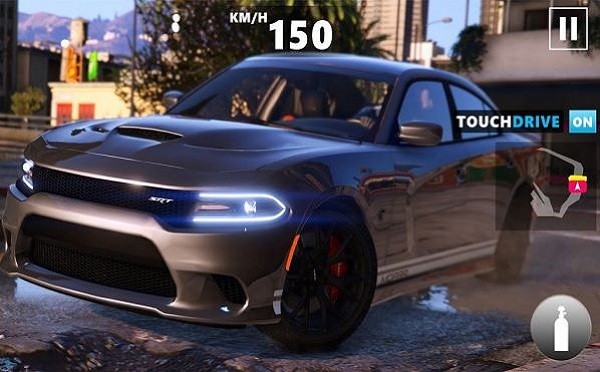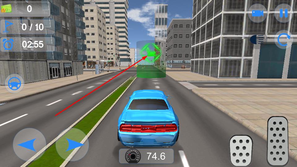 2、利用左下角方向按钮与右下角踏板,操控车辆转向、加速,跟随绿色目标标识行驶,依据路况灵活调整车速,穿越城市街道。