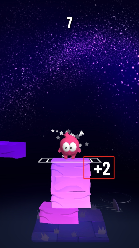 1、操控红框内粉色角色,在星空背景下,看准紫色平台位置,点击屏幕让角色跳跃,落在平台上。