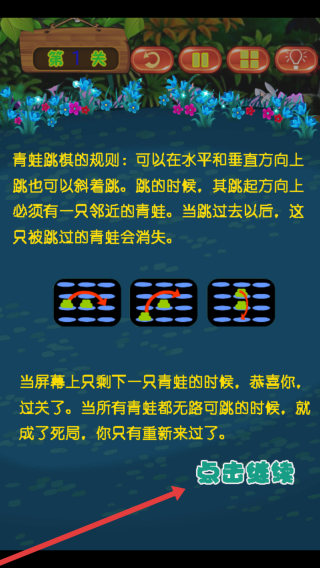 2、在规则说明界面点击文字点击继续,进入第1关游戏场景,准备按规则操作青蛙进行跳跃。
