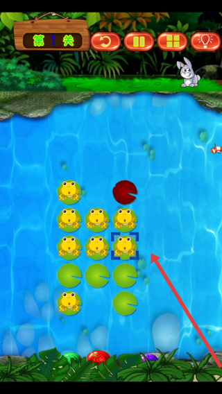 3、在第1关棋盘,选取合适青蛙,沿水平、垂直或斜向跳过邻蛙使其消失,推进解谜进程达成关卡目标。