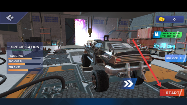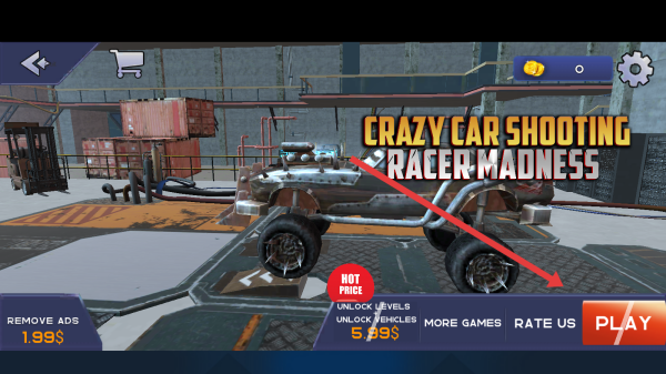 1、点击Crazy-Car-Shooting-Racer-Madness主界面右下角红色PLAY按钮,进入车辆选择与准备界面。