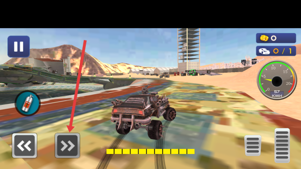 3、在游戏中点击左下角加速按钮双箭头图标,操控赛车在赛道加速行驶,推进比赛进程。