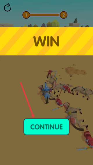 3、当击败所有敌方士兵后,游戏显示WIN,此时点击CONTINUE按钮即可进入下一个关卡。