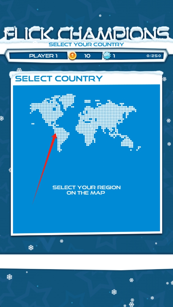 1、在Flick-Champions界面,于世界地图选代表区域,开启冰雪竞技之旅,点击选择地图。