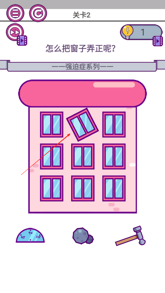 1、不需要使用下方任何一个道具,只需滑动歪了的窗户,将其旋转摆正后,即可通过关卡。