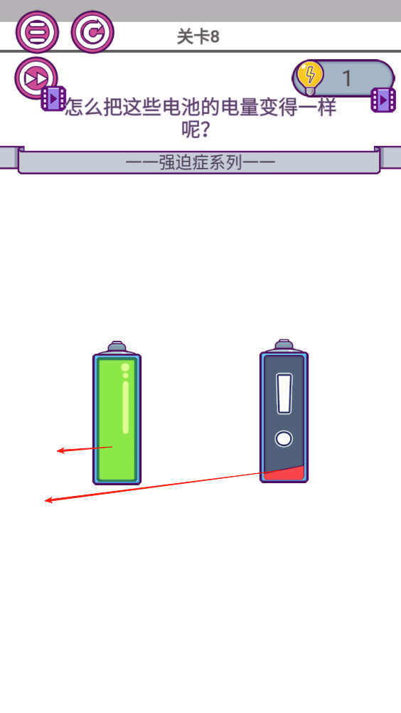 3、这一关卡需要电池的电量都一样,我们只要将左边的满格电量拖出来丢到一旁,将另一边的感叹号电量拖出来也丢到一旁,两边就是一样的电量。