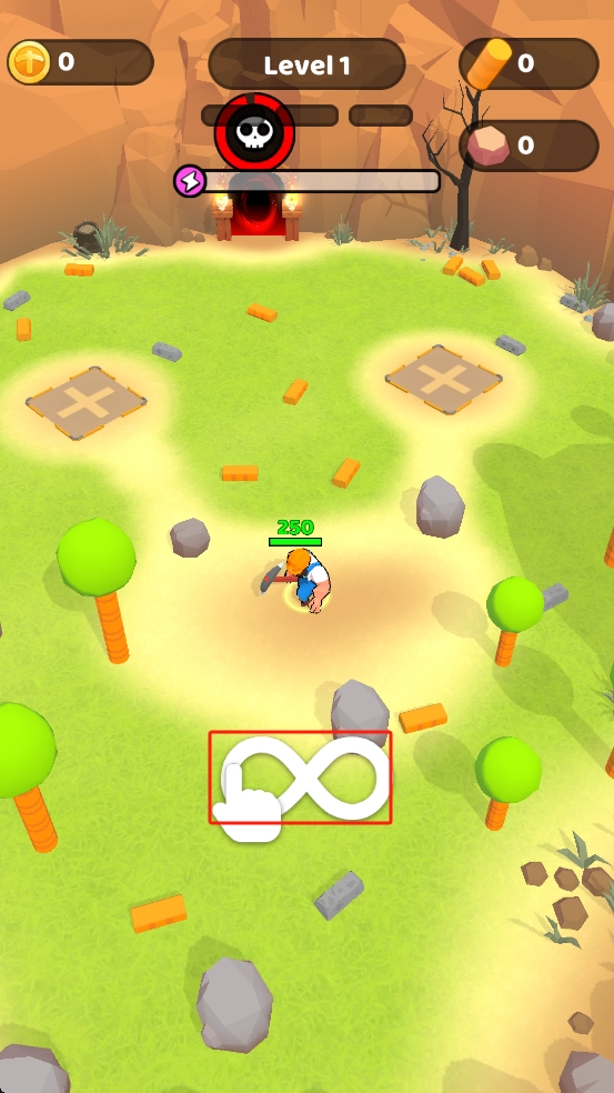 1、进入作品后我们操控持工具的小人在草地移动,收集地面橙色、灰色的木材、石头等资源。