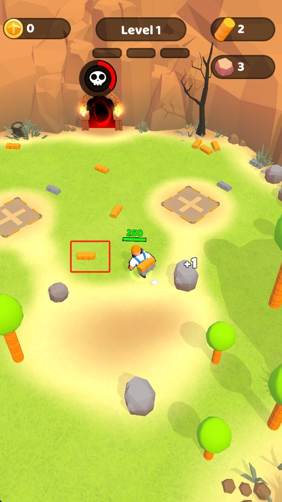 2、移动时触碰橙色木材,自动收集,资源栏数量更新,持续收集场景里的石头、树木,积累物资。