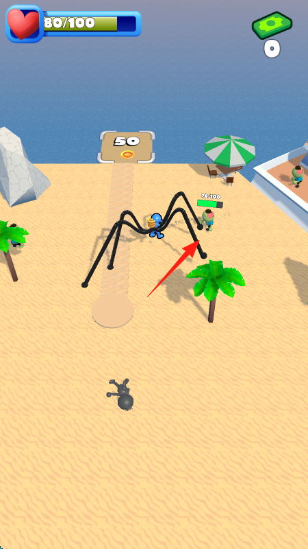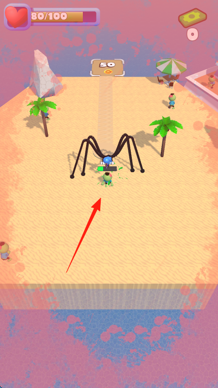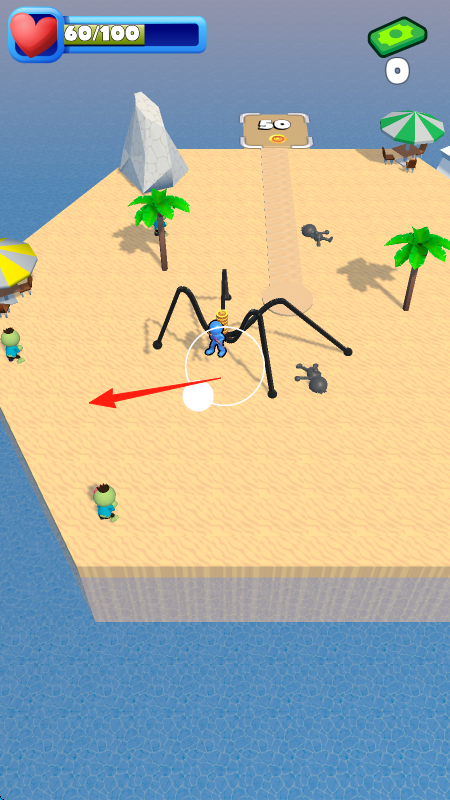 1、操控蜘蛛或类似怪物,在沙滩场景移动,靠近人类如绿色小人,自动攻击、吞噬。