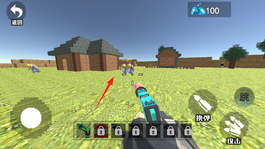 1、操控角色,用左侧摇杆移动,右侧攻击按钮射击,瞄准箭头指向的敌人初始为小人,后为戴菠萝帽的熊。