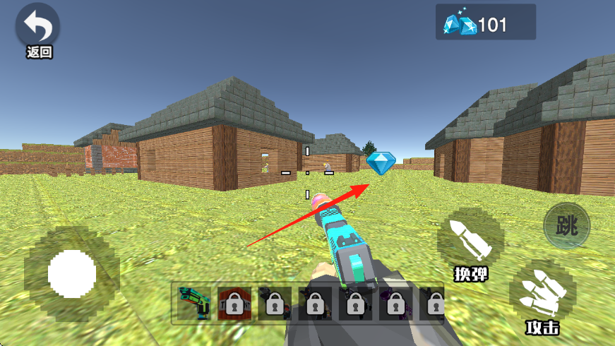3、击败敌人后,出现钻石道具,射击或靠近收集钻石数量从100变为101,探索房屋区域,完成关卡目标。