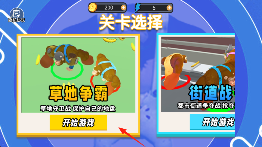 1、进入游戏到关卡选择界面,选草地争霸或者街道战,点击开始游戏进入对应场景。