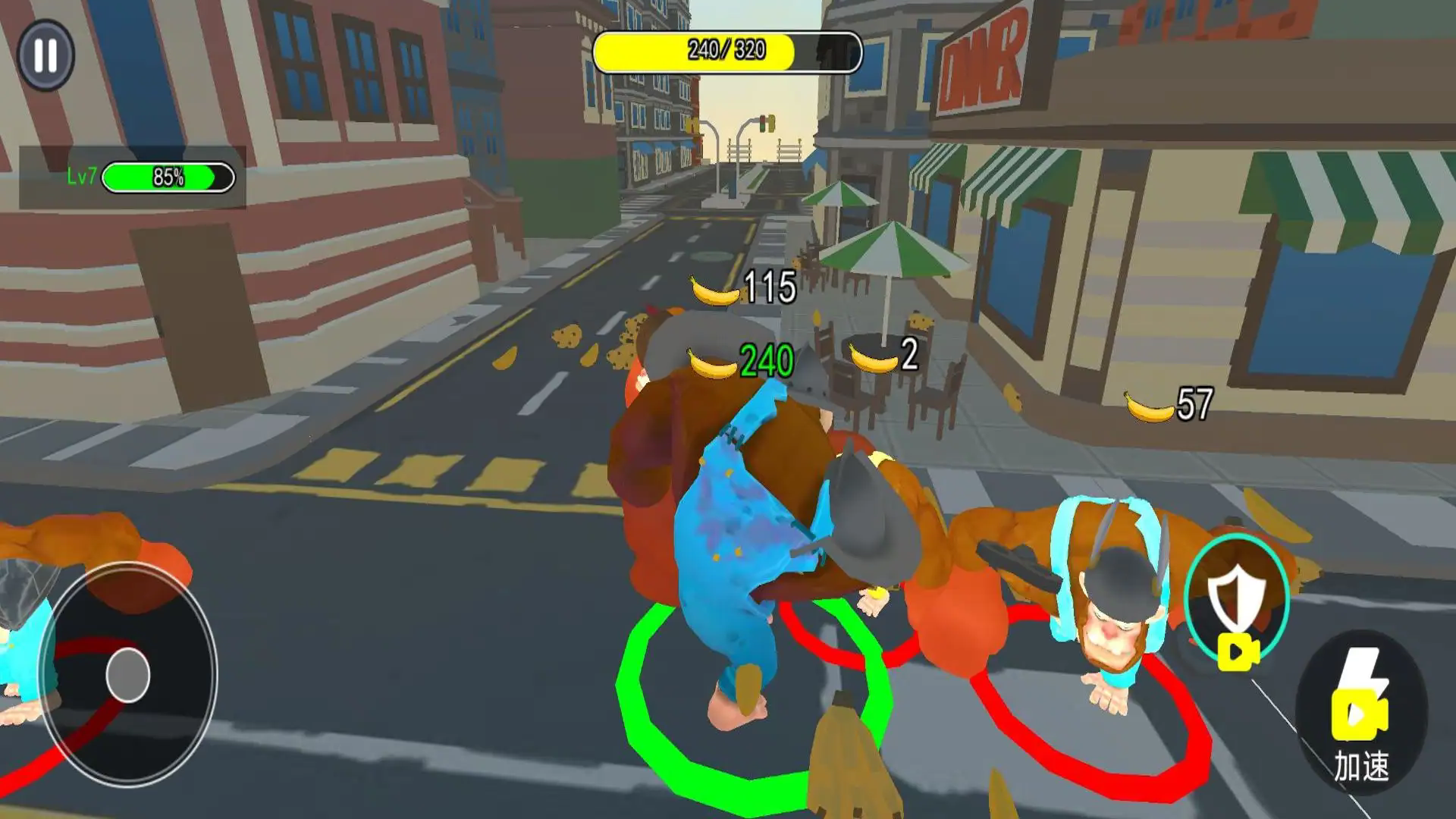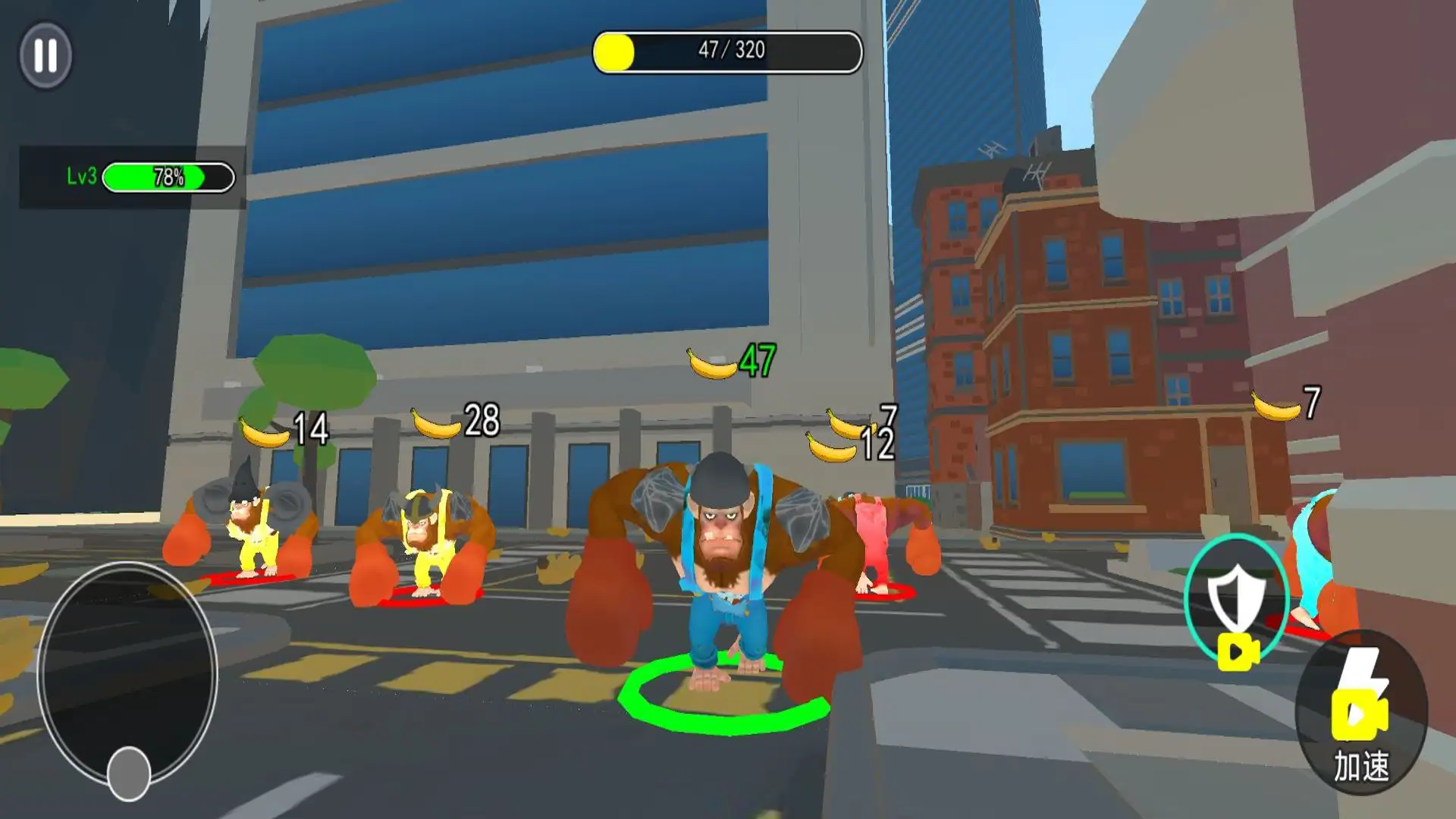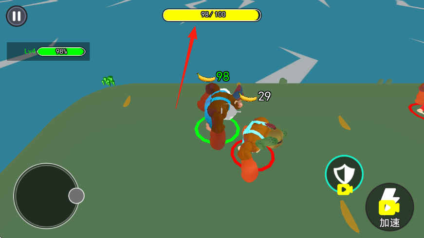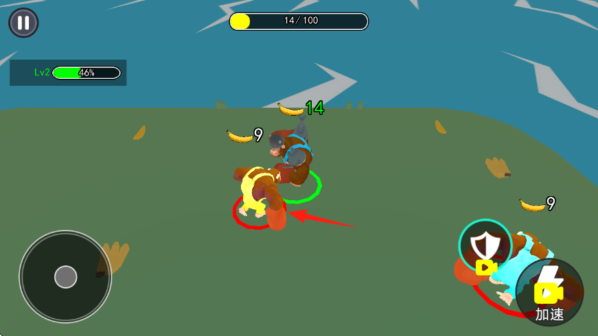 2、游戏中操控猩猩,通过左侧摇杆移动,靠近香蕉收集,提升上方进度,同时也要注意躲避等级比自己高的敌人。