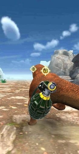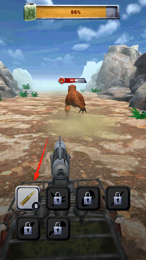 2、切换到载具射击视角,选子弹道具下方栏,瞄准前方恐龙攻击,留意弹药、血量。