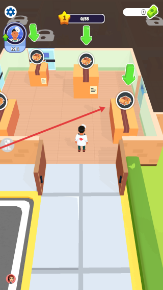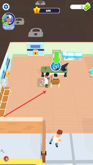 3、根据患者需求,将其引导至对应治疗区域,如箭头指向的诊疗床,完成救治任务,提升医院等级与收益。