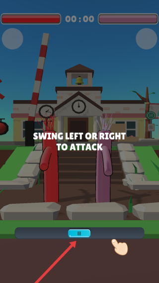 2、战斗准备阶段,按照提示左右摆动下方操控杆,调整角色攻击方向,为对紫色对手发起进攻做好操作准备。
