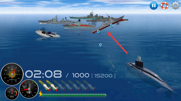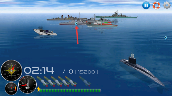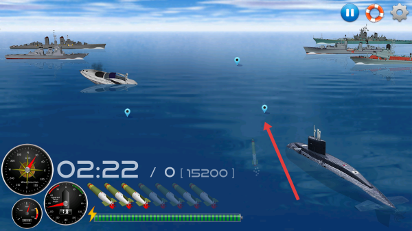1、游戏开局操控潜艇,沿箭头方向锁定敌方战舰,需要提前准备鱼雷,瞄准后发射,攻击目标舰船。