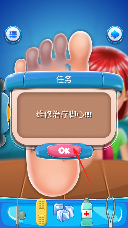 2、接到维修治疗脚心任务,点OK确认,然后用下方工具,像镊子、药膏啥的,处理脚心伤口,一步步修好受伤的脚心,完成治疗任务。
