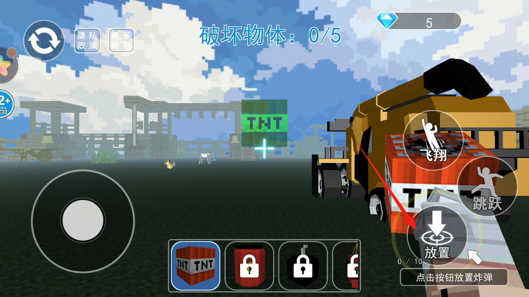 2、选好TNT炸弹道具,点右侧放置按钮,把炸弹放地上,放好后,找要破坏的物体,等炸弹爆炸,完成破坏目标,推进关卡进度。