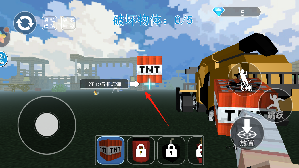 3、放置TNT后,准心对准空中TNT炸弹,点攻击或者引爆按钮,让炸弹连锁爆炸,靠这招破坏场景里的物体,完成破坏物体任务,看看能炸掉多少目标。