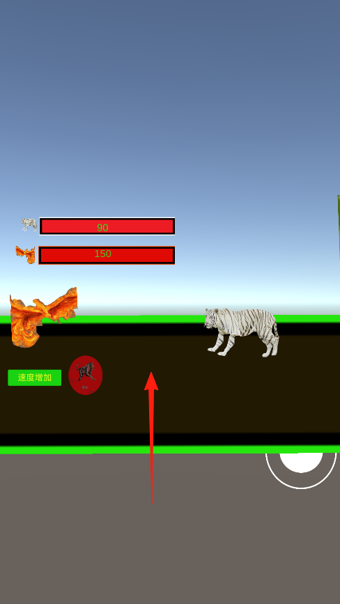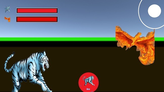 3、进入对战场景,操控选好的火焰角色,和白虎对战,点技能按钮移动角色,想办法打掉白虎血量,同时注意自己血量,赢下这场动物对决,看看谁更厉害。