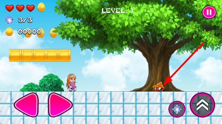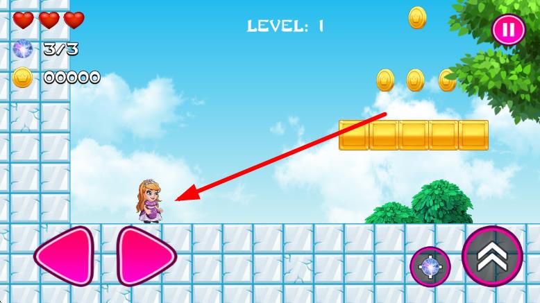 2、用左右粉色箭头键控制公主移动,遇到金币自动收集,看到黄色方块平台,把握时机按跳跃键跨越,推进关卡。