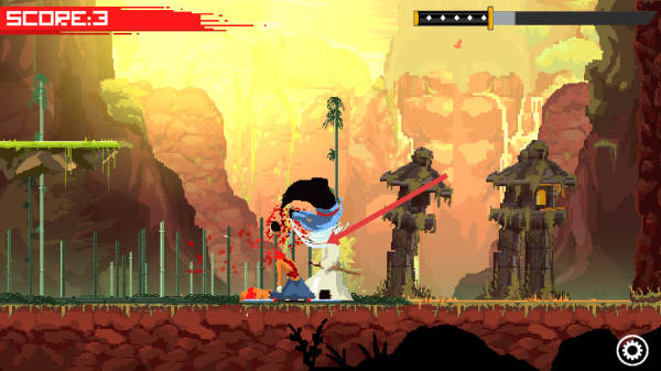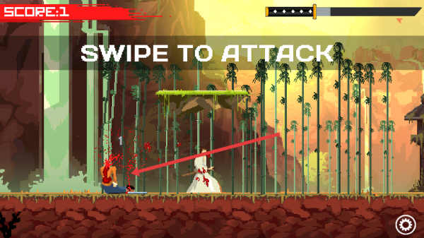 1、开局进入战斗画面,看到SWIPE TO ATTACK提示,滑动屏幕操控武士攻击,对准敌人快速划动,引发斩杀。