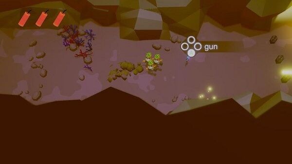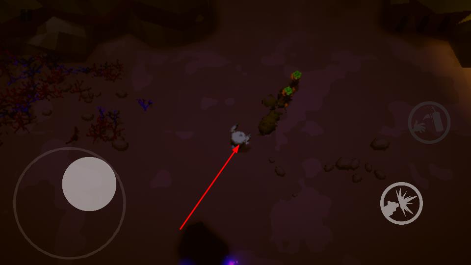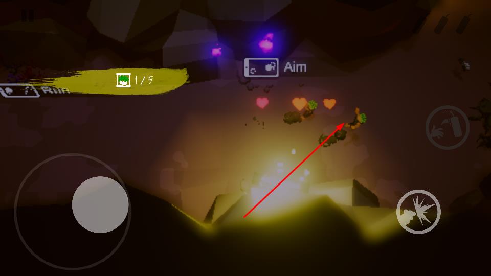 1、进入地下场景,左侧摇杆控制移动,点击右侧攻击按钮喷雾、爆炸图标,瞄准带爱心的植物敌人射击,完成1/5等目标击杀任务。