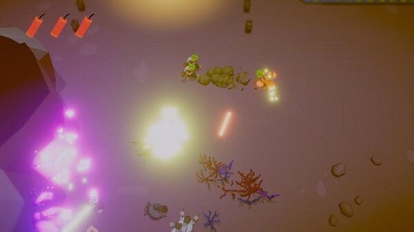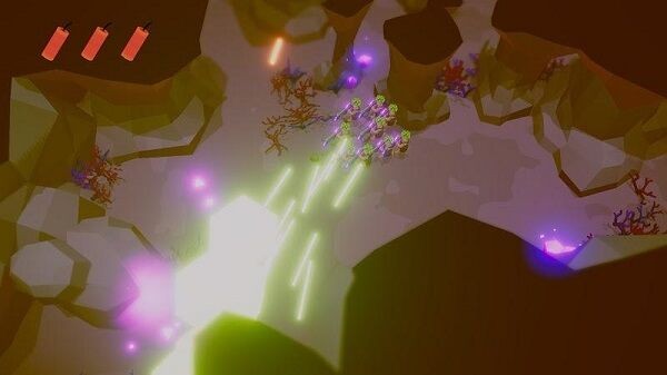 2、攻击触发光影特效,消灭敌人后获取资源,留意场景中紫色光点等互动元素,补充能力或推进流程。