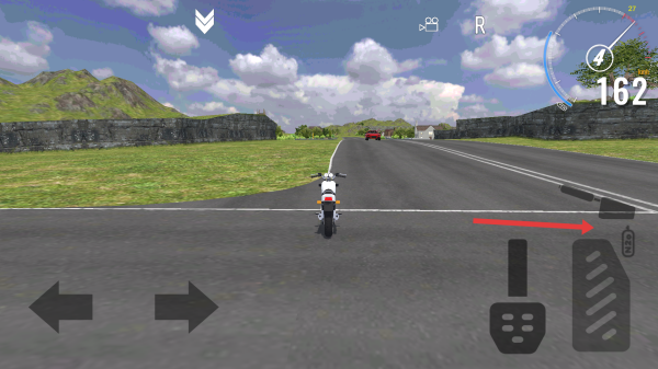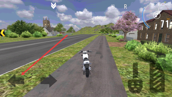 1、开局游戏在公路上,按右侧油门键加速,左右箭头控制方向,沿道路行驶,避开偏离路线。
