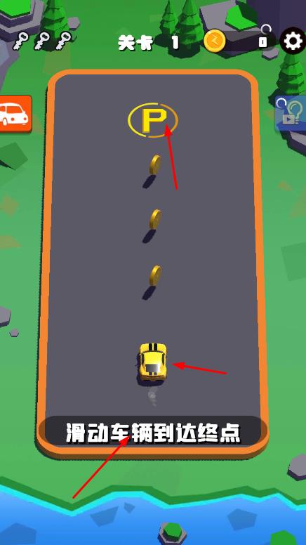 1、进入游戏,在关卡选择界面,选择关卡1,在场景中,根据提示滑动车辆到达终点。