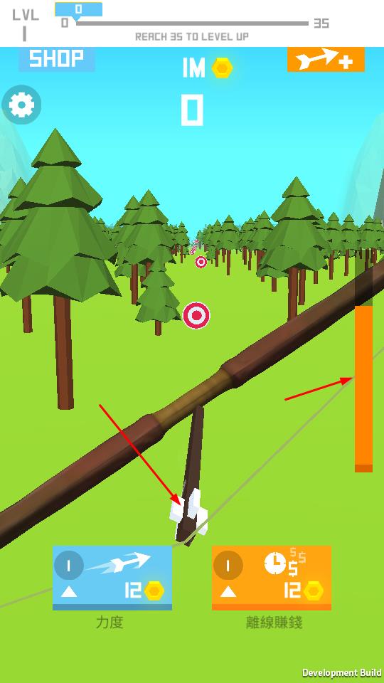 1、主界面拉弓,借助下方力度按钮提升射击力量,离线赚钱积累收益,瞄准远处靶心,调整角度后发射箭矢。