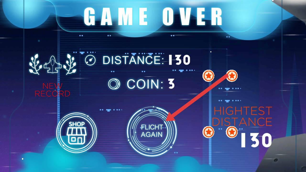 3、碰到障碍物游戏结束后,点击FLICHT AGAIN的按钮,重新开始挑战,尝试突破更远飞行距离纪录。