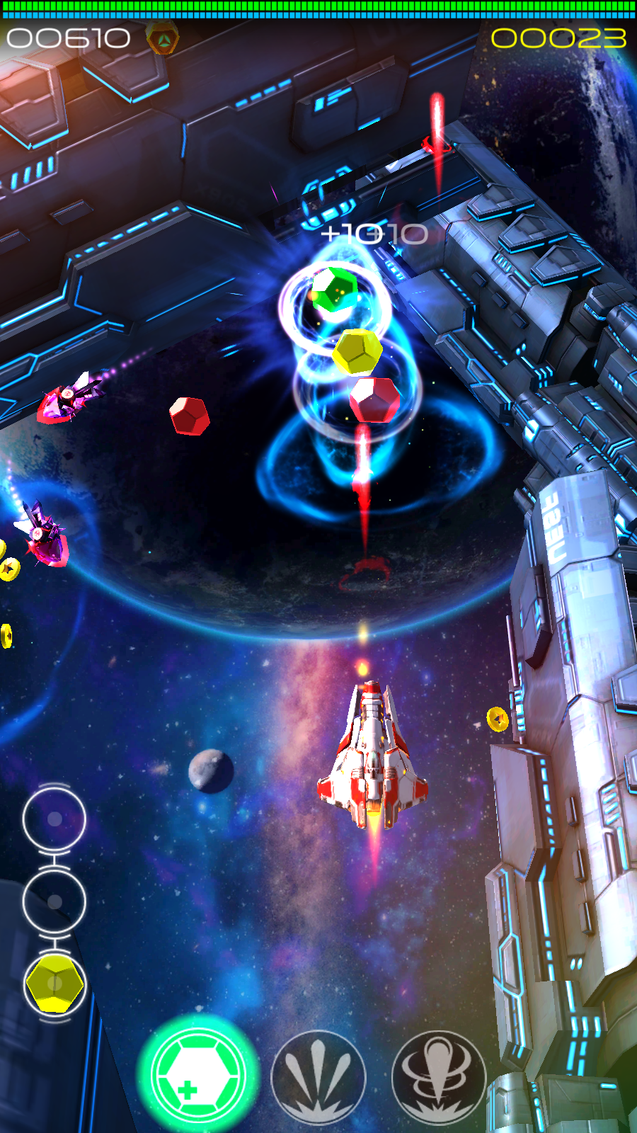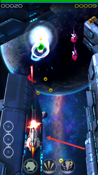 1、战舰驾驶与射击战斗:选择心仪战机出发,驾驶战舰在外太空移动,瞄准外星战舰射击,利用武器优势摧毁敌人,在绚丽战斗中完成关卡任务。