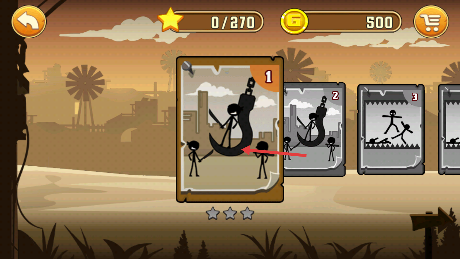 1、选择标有【1】的关卡卡牌,顶部【0/270】星星进度需完成任务积累,初始持有【500】金币可备用。