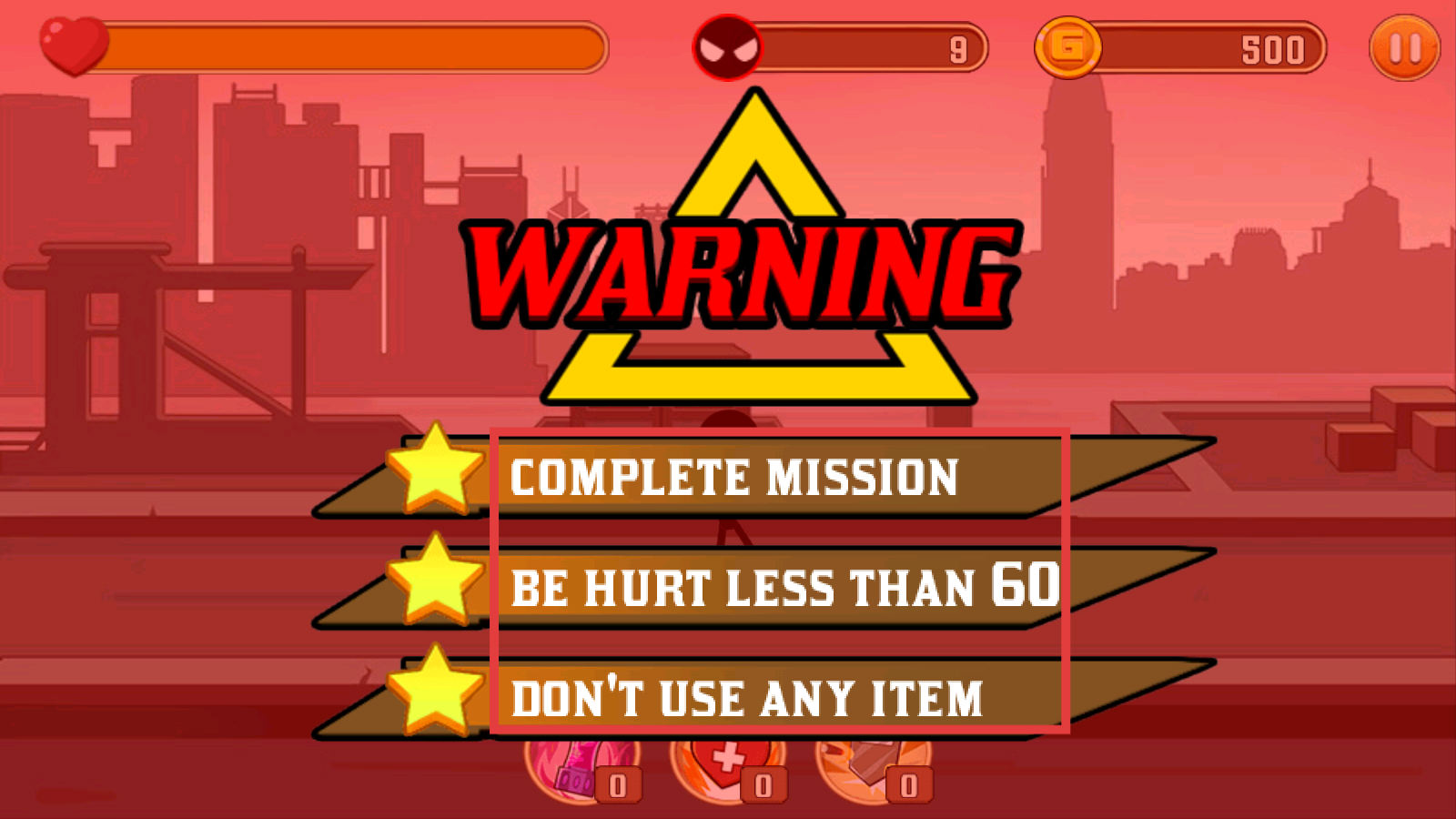 2、任务界面有【COMPLETE-MISSION】等三目标,需规划操作,受伤少于【60】且不使用道具,提升通关评价。