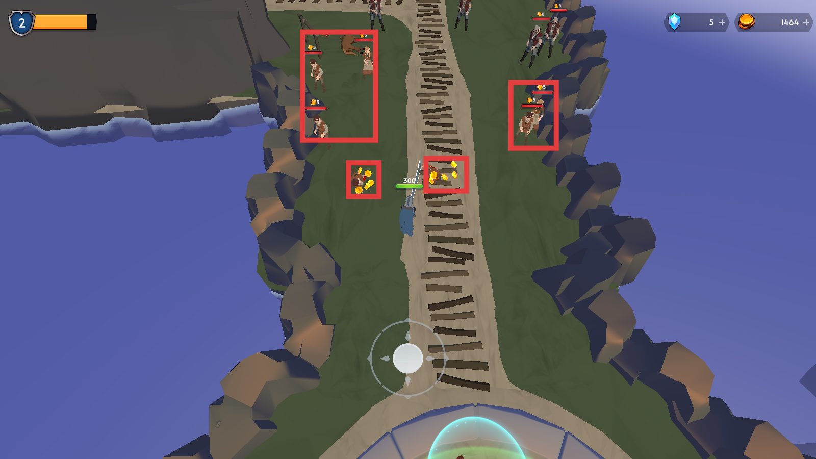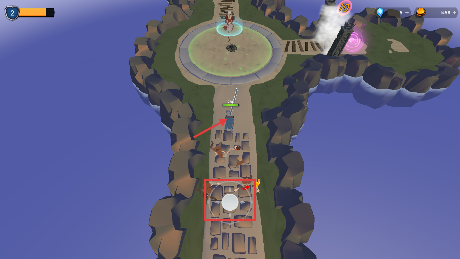 1、操控下方摇杆移动角色,沿路径推进清理敌人,留意左上角等级与血量状态。