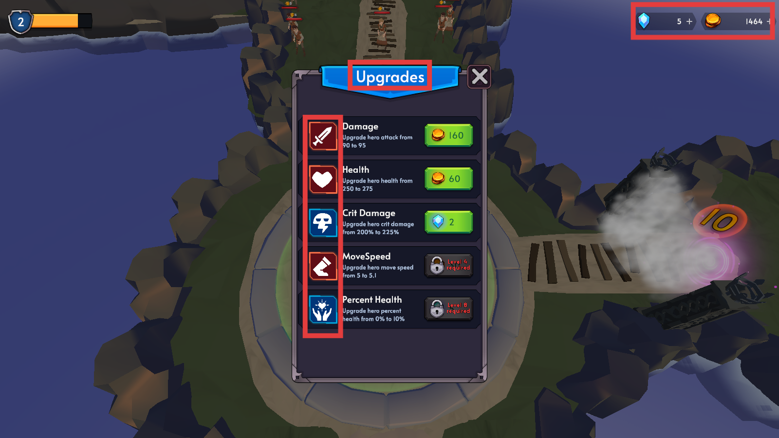 2、打开【Upgrades】界面,优先用金币升级【Damage】和【Health】,提升基础战力再挑战。