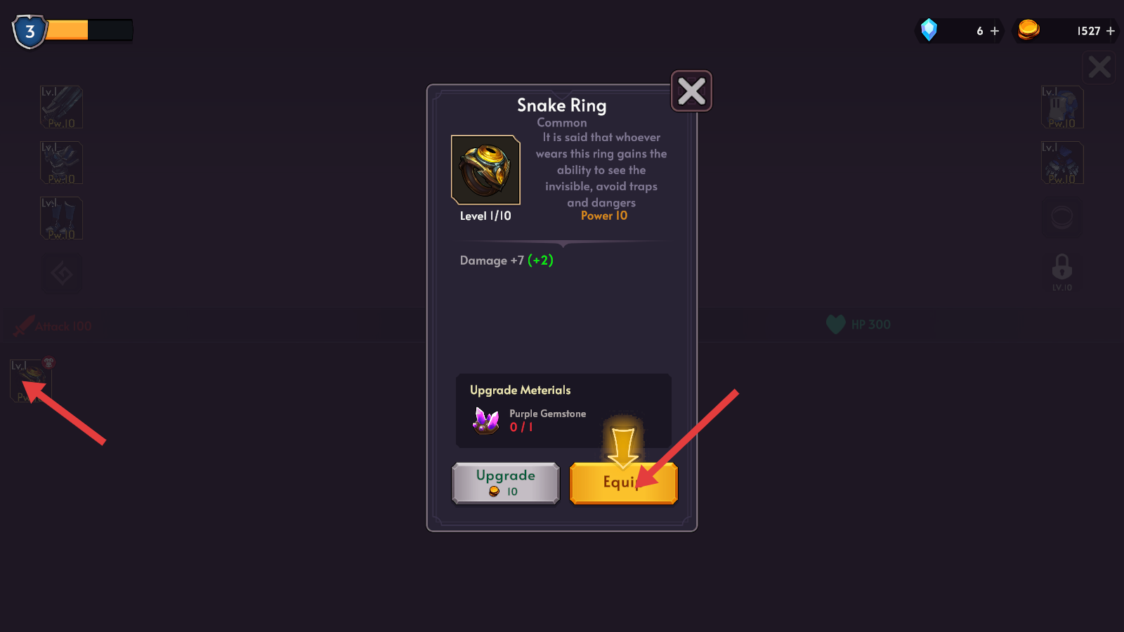 4、获得【Snake-Ring】装备后,点击【Equip】按钮穿戴,提升伤害属性助力战斗。