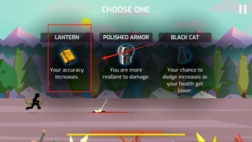 1、看到“CHOOSE ONE”界面时,点击“LANTERN”、“POLISHED ARMOR”或“BLACK CAT”中任意一件装备即可选定并关闭弹窗。