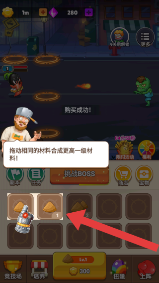 2、合成后获得新材料,这是更高一级的材料,玩家需要运用这个材料区击杀迎面而来的敌人。
