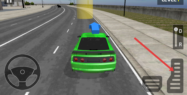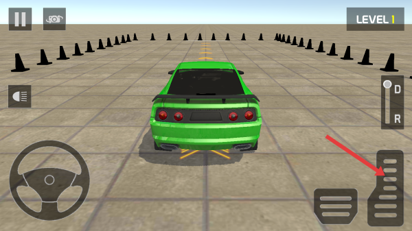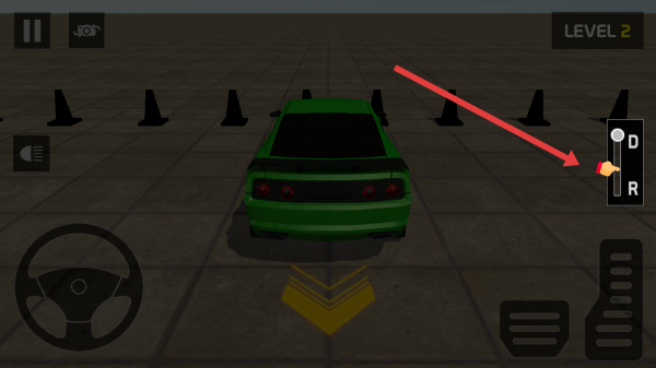 1、选择科目二的关卡,用方向盘来控制方向,配合刹车、油门,沿黄色标线倒车入库,避开锥形桶。