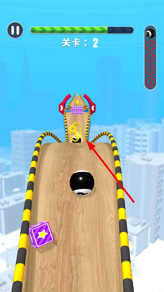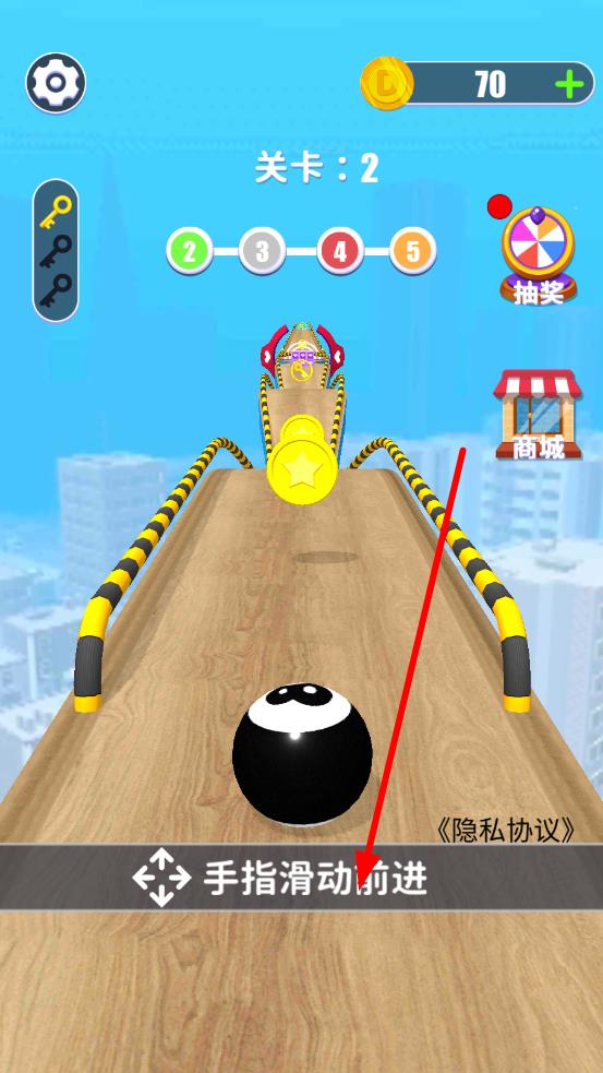 1、进入关卡2,根据提示手指滑动前进,操控黑球沿木质跑道移动,规划首波金币与道具的收集路线,开启跑酷。