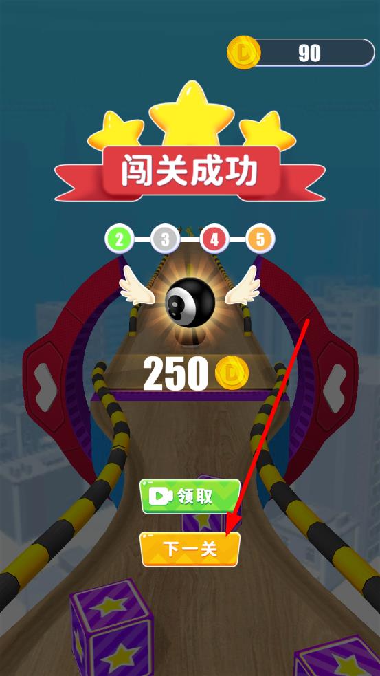 3、成功抵达关卡终点,屏幕显示闯关成功,获得金币奖励,点击下一关进入更复杂的跑道,延续跑酷之旅。