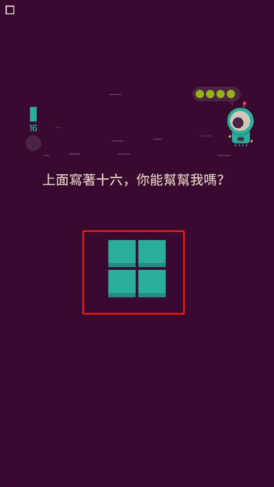 1、看到上面写着十六提示,观察左侧数值16,点击下方四个青色方块,尝试组合或移动,让其与16关联。